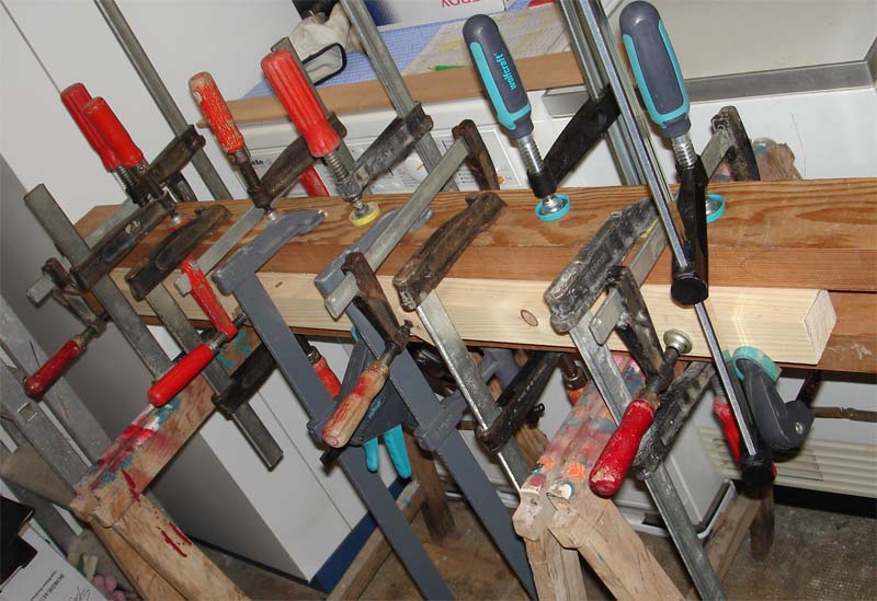 et pressage avec une "forêt" de serre-joints.